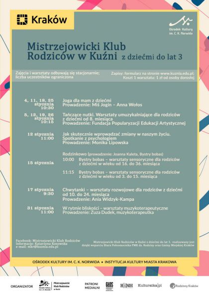 Wszystkie zajęcia odbywają się stacjonarnie – Klub Kuźnia Ośrodka Kultury im. C. K. Norwida, os. Złotego Wieku 14. Obowiązują zapisy na stronie www.kuznia.edu.pl, zakładka Mistrzejowicki Klub Rodziców. Formularz zapisów będzie dostępny od 28 grudnia 2021 r., od godz. 11:00.