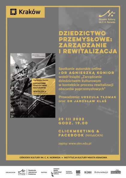 Spotkanie autorskie online z dr Agnieszką Konior wokół książki „Zarządzanie dziedzictwem kulturowym w kontekście procesu rewitalizacji obszarów poprzemysłowych”.