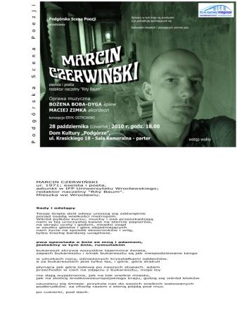 W najbliższy czwartek w cyklu Podgórska Scena Poezji odbędzie się spotkanie autorskie Marcina Czerwińskiego eseisty i poety, redaktora naczelnego „Rity Baum”.