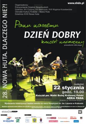 Kolędy oraz piosenki Marka Grechuty, w aranżacjach zespołu Dzień Dobry, usłyszeć będzie można na kolejnym koncercie z cyklu Nowa Huta. Dlaczego Nie?!, który odbędzie się 22 stycznia o godzinie 19.00. Już po raz czwarty zagościmy w parafii Matki Bożej Królowej Polski (Arka Pana). Zapraszaj: Porozumienie Dzielnic Nowohuckich - Dzielnice: XIV Czyżyny, XVI Bieńczyce, XVII Wzgórza Krzesławickie, Ośrodek Kultury Kraków-Nowa Huta oraz Dzielnica XVIII Nowa Huta. Bezpłatne zaproszenia można odbierać od 11.01. w: