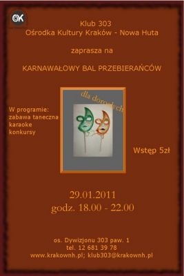 Na pełen radości i dobrej zabawy bal przebierańców dla dorosłych zaprasza Klub 303 Ośrodka Kultury Kraków – Nowa Huta.