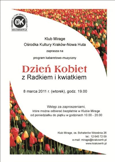 Na wieczór kabaretowy dla pań z okazji Dnia Kobiet zaprasza Klub Mirage Ośrodka Kultury Kraków-Nowa Huta. W programie: recital piosenek o miłości w wykonaniu Radosława Omiecińskiego oraz karaoke. Przybyłe panie otrzymają kwiaty i drobny upominek.