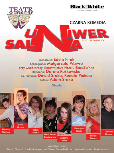 "Uniwersalna" to czarna komedia. Inna niż te dotąd prezentowane kilkutysięcznej widowni. Operujemy w niej elementami groteski oraz ironią słowną i sytuacyjną odwołując się do absurdu. To historia trzech kobiet, którym przyszło dzielić życie z wyjątkowo paskudnymi facetami. Nadchodzi chwila, kiedy robiąc podsumowanie swojego życia, dochodzą do wniosku,że wszystko mogłoby wyglądać inaczej gdyby znalazła się na nich wszystkich, ta jedna, jedyna UNIWERSALNA. I znajdują taką. To......śmierć. W Jej obliczu każdy stara się być takim jakim być powinien, bez cienia egoizmu i hedonistycznych zapędów.