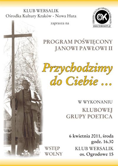 Zapraszamy do Klubu Wersalik Ośrodka Kultury Kraków-Nowa Huta na spotkanie poświęcone osobie Jana Pawła II, podczas którego wystąpi Klubowa Grupa Poetica z Klubu Dukat Ośrodka Kultury Kraków – Nowa Huta z programem artystycznym o Ojcu Świętym.