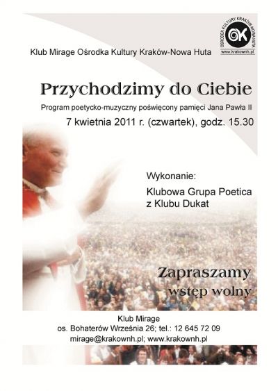 Klub Mirage Ośrodka Kultury Kraków – Nowa Huta zaprasza 7 kwietnia (czwartek) 2011 r. o godz. 15.30 na program poetycko-muzyczny o Ojcu Świętym.