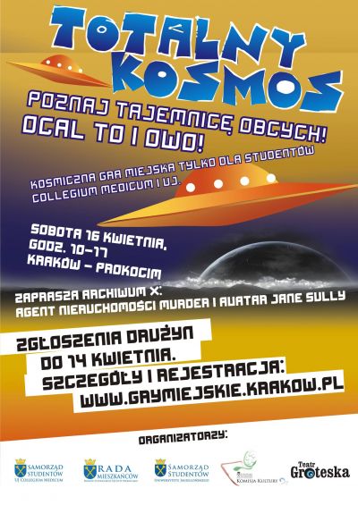 Teatr Groteska wraz z Radą Mieszkańców Domów Studenckich Collegium Medicum UJ w Prokocimiu organizuje kolejną grę miejską „Totalny kosmos”, która odbędzie się w sobotę 16 kwietnia w Krakowie.