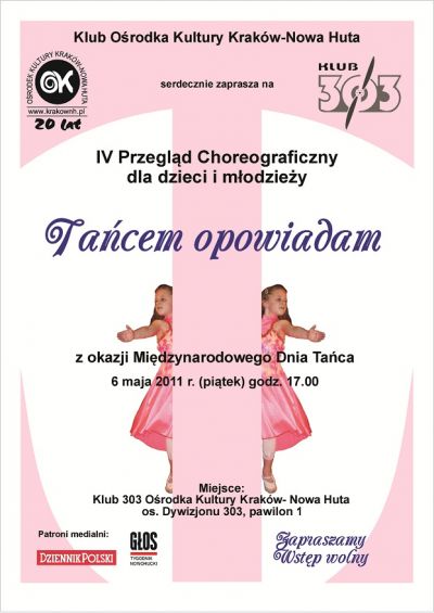 Klub Ośrodka Kultury Kraków – Nowa Huta zaprasza 6 maja (piątek) 2011 r. o godz. 17.00 na prezentację twórczości choreograficznej dzieci z okazji Międzynarodowego Dnia Tańca.