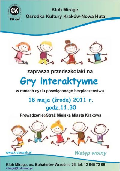 Klub Mirage Ośrodka Kultury Kraków-Nowa Huta zaprasza na cykliczną imprezę dla przedszkolaków, prowadzoną przez Jacka Gronowskiego - funkcjonariusza Straży Miejskiej Miasta Krakowa, z zakresu bezpieczeństwa i unikania zagrożeń.