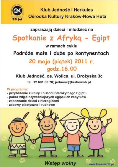 Spotkanie z Afryką to pierwsze spotkanie w ramach podróżniczego cyklu Podróże małe i duże po kontynentach, którego głównym celem jest przybliżenie dzieciom i młodzieży kultur poszczególnych krajów i kontynentów poprzez różnorodne działania plastyczne, muzyczne i teatralne. Na pierwszym spotkaniu uczestnicy poznają historię i kulturę Egiptu, a także przekazane zostaną im podstawowe informacje dotyczące tak zwanego Czarnego Lądu.