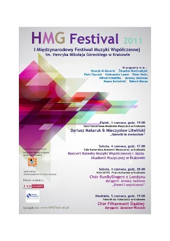 HMG Festival - I Międzynarodowy Festiwal Muzyki Współczesnej im. Henryka Mikołaja Góreckiego odbędzie się w Krakowie w dniach od 3 do 5 czerwca 2011 roku.
