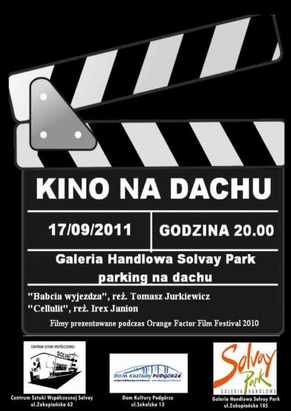 W najbliższą sobotę, 17 września, w ramach Podgórskiej Jesieni Kulturalnej na dachu Galerii Handlowej Solvay Park zaprezentowane zostaną dwa filmy krótkometrażowe prezentowane podczas zeszłorocznego Orange Factor Film Festival: „Babcia wyjeżdża", reż. Tomasz Jurkiewicz oraz "Cellulit,reż. Irex Janion. Seans rozpocznie się o godzinie 20:00.