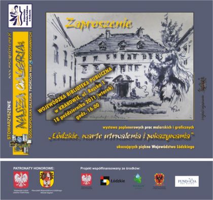 Zapraszamy 18 października 2011 r. o godz. 16:00 do Wojewódzkiej Biblioteki Publicznej w Krakowie, przy ul. Rajska 1, na otwarcie i do obejrzenie wystawy prac malarskich i graficznych, powstałych podczas tegorocznego, VI Ogólnopolskiego Pleneru Malarskiego w ramach realizacji projektu pn. "Łódzkie, warte utrwalenia i pokazywania", jaki w dniach 21 sierpnia – 3 września 2011 zorganizowało Stowarzyszenie „NASZA GALERIA”.