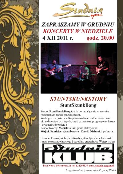 Zespół StuntSkunkBang to trio poruszające się w szeroko rozumianym nurcie muzyki fusion.