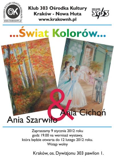 Klub 303 Ośrodka Kultury Kraków-Nowa Huta (os. Dywizjonu 303 1) zaprasza 9 stycznia (poniedziałek) 2012 r. o godz. 19.00 na wernisaż prac Anny Cichoń i Anny Szarwiło.