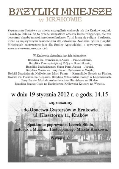 W cyklu otwartych spotkań p.n. Bazyliki Mniejsze w Krakowie zapraszamy Państwa do miejsc szczególnie ważnych tak dla Krakowian, jak i każdego Polaka. Są to przede wszystkim obiekty kultu religijnego, ale też bezcenne skarby naszej narodowej kultury. Tutaj łączą się religia i kultura, które są najwyższymi wartościami dla człowieka. Nadanie tytułu Bazylik Mniejszych zastrzeżone jest dla Stolicy Apostolskiej, a towarzyszy temu zawsze stosowna uroczystość. W Krakowie aktualnie jest ich jedenaście: Bazylika św. Franciszka z Asyżu - Franciszkanie, Bazylika Przenajświętszej Trójcy – Dominikanie, Bazylika Najświętszego Serca Pana Jezusa – Jezuici, Bazylika Mariacka, Bazylika oo. Cystersów w Mogile, Kościół Nawiedzenia Najświętszej Marii Panny - Karmelitów Bosych na Piasku, Kościół św. Floriana na Kleparzu, Bazylika Miłosierdzia Bożego w Łagiewnikach, Bazylika św. Michała Archanioła i św. Stanisława na Skałce, Bazylika Bożego Ciała na Kazimierzu, Królewska Katedra na Wawelu.