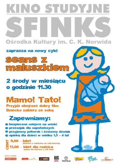 Podczas cyklu SEANS Z MALUSZKIEM proponujemy wspólne, dopołudniowe projekcje dobrych filmów, na które zapraszamy rodziców wraz z dziećmi gwarantując szczególnie dobrany repertuar (kino o wysokich walorach zdjęciowych i muzycznych, bez scen przemocy), zaplecze organizacyjne przyjazne rodzicom (przewijak dla najmłodszych, bezpieczne miejsce na wózki oraz możliwość pozostawienia dzieci w wieku 1.5 - 4 lat pod opieką w pomieszczeniach obok kina) a także przyjemny półmrok na sali kinowej i ściszony dźwięk dla tych rodziców, którzy zechcą oglądnąć film w towarzystwie swojej pociechy. Spotkania odbywają się w Kinie Sfinks dwa razy w miesiącu, w godzinach dopołudniowych.