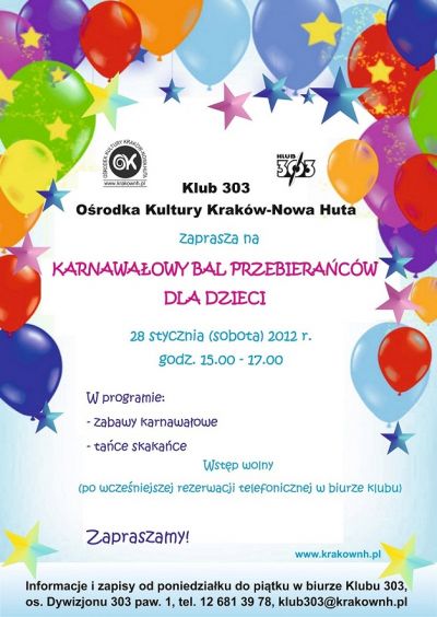Klub 303 Ośrodka Kultury Kraków-Nowa Huta (os. Dywizjonu 303 1) zaprasza 28 stycznia (sobota) 2012 o godz. 15.00 na imprezę taneczną.