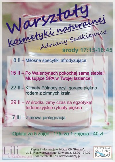 Warsztaty prowadzi Adriana Sadkiewicz - pasjonatka kosmetyki naturalnej, która od kilku lat prowadzi autorskie warsztaty hobbystyczne (m.in. podczas festiwali PROGRESSteron, Festiwalu Rzeczy Dobrych, w Meli-Melo Akademii Rozwoju Kobiet, z Pracownią Poskrzydła) oraz redaguje artykuły do portali kobiecych. Z powodzeniem prowadzi inspirujący blog o tematyce kosmetyki naturalnej lilinaturalna.blogspot.com. Właścicielka sklepu z kosmetykami naturalnymi Lili Natura.pl.
