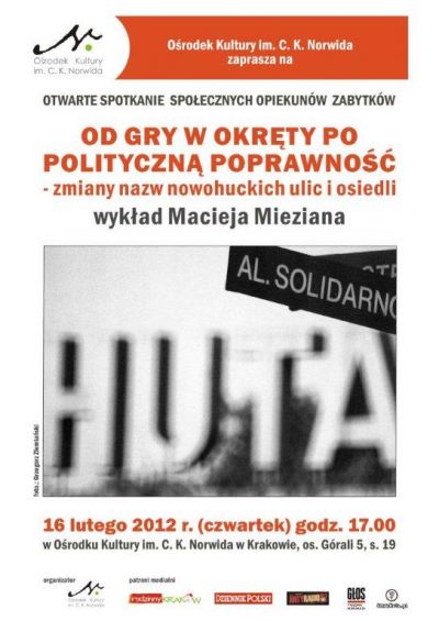 W ramach otwartego spotkanie społecznych opiekunów zabytków i miłośników historii zapraszamy na otwarty wykład historyka Macieja Mieziana poświęcony zmianom nazw nowohuckich ulic i osiedli.