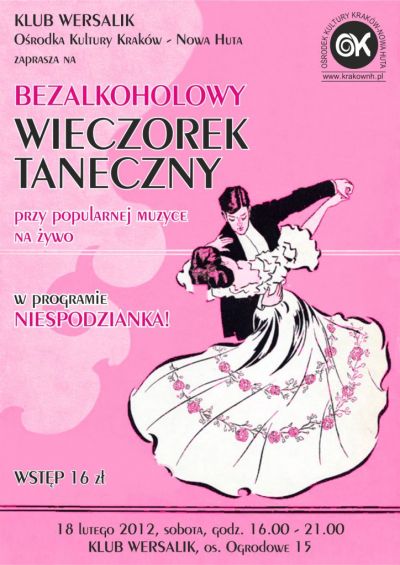 Klub Wersalik Ośrodka Kultury Kraków-Nowa Huta zaprasza na pożegnanie karnawału podczas wieczorku tanecznego przy popularnej muzyce na żywo w wykonaniu zespołu Mariana Soi. W programie niespodzianka.