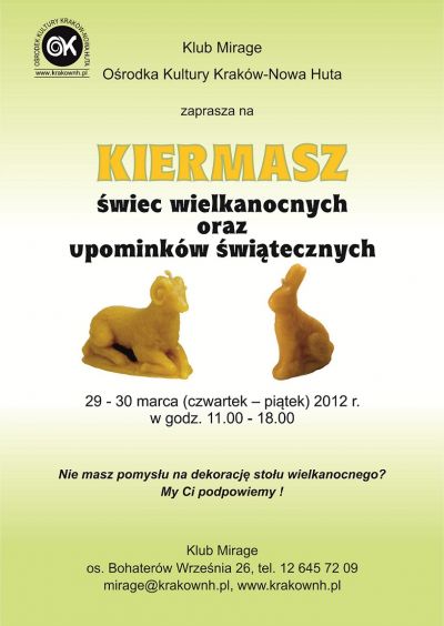Klub Mirage Ośrodka Kultury Kraków-Nowa Huta (os. Bohaterów Września 26) zaprasza na kiermasz niepowtarzalnych świec ręcznej roboty.