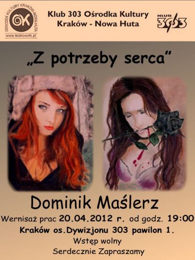 Klub 303 Ośrodka Kultury Kraków-Nowa Huta (os. Dywizjonu 303 1) zaprasza na otwarcie indywidualnej wystawy prac Dominika Maślerza, w ramach cyklu Z potrzeby serca…