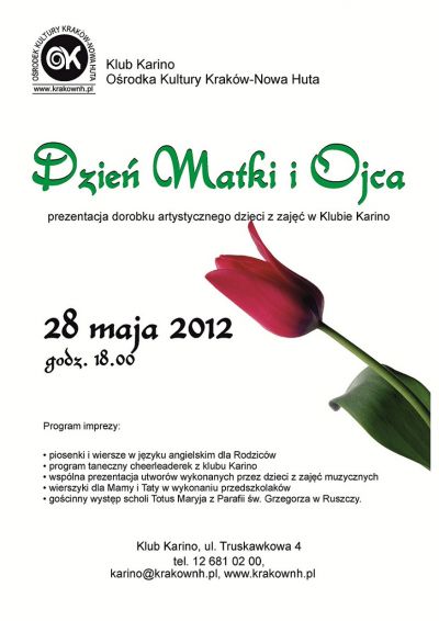 Klub Karino Ośrodka Kultury Kraków-Nowa Huta (ul. Truskawkowa 4) zaprasza 28 maja 2012 r. (poniedziałek) o godz. 18.00 na imprezę z okazji Dnia Matki i Ojca.