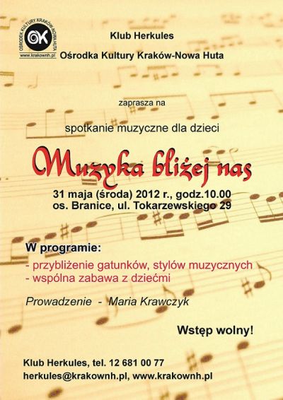 Klub Herkules Ośrodka Kultury Kraków-Nowa Huta (ul. Tokarzewskiego 29) zaprasza na kolejne spotkanie z zakresu edukacji muzycznej dla dzieci, które odbędzie się 31 maja 2012 r. (czwartek) o godz. 10.00.