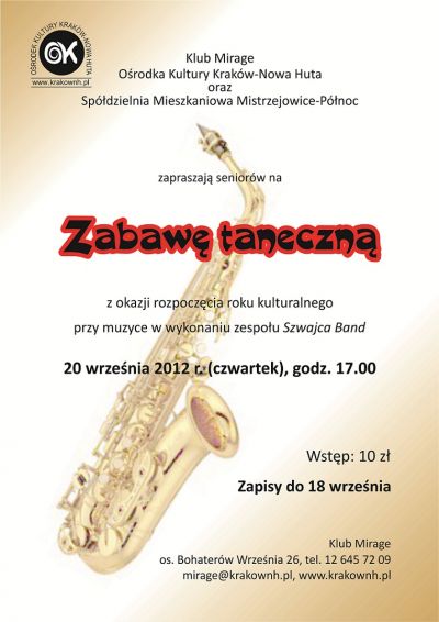 Klub Mirage Ośrodka Kultury Kraków-Nowa Huta (os. Bohaterów Września 26) zaprasza na zabawę taneczną z okazji Międzynarodowego Dnia Seniora.