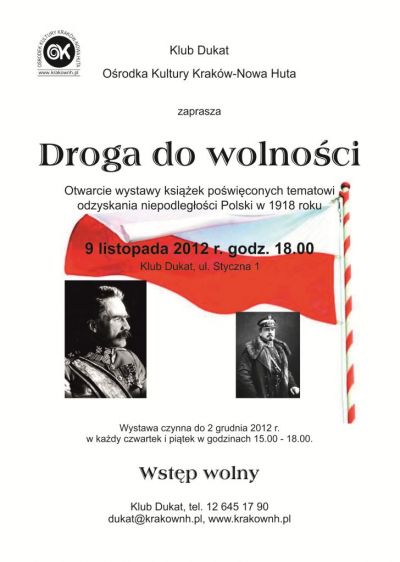 Klub Dukat Ośrodka Kultury Kraków-Nowa Huta zaprasza na wystawę książek poświęconych tematowi odzyskania przez Polskę niepodległości w 1918 r. Będzie można także obejrzeć fotografie dokumentów oraz miejsc związanych z postacią gen. Józefa Hallera.