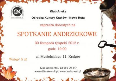 Kiedyś zaszczytów wróżb andrzejkowych doświadczały tylko panny, a przepowiednie dotyczyły wyłącznie miłości. Teraz wróżą wszyscy, niezależnie od wieku, płci i stanu cywilnego. Zapraszamy wszystkich dorosłych do Klubu Aneks Ośrodka Kultury Kraków-Nowa Huta.