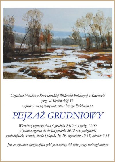 Czytelnia Naukowa Krowoderskiej Biblioteki Publicznej w Krakowie przy ul. Królewskiej 59 zaprasza na wystawę prac Jerzego Pulchnego. Wernisaż wystawy dnia 6 grudnia 2912 o godz. 17.00