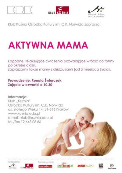 Zapraszamy do Klubu Kuźnia Ośrodka Kultury im. C.K.Norwida, os. Złotego Wieku 14, godz. 10.30-11.20 na zajęcia dla mam z dziećmi: Aktywna mama.