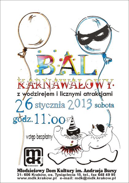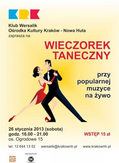 Klub Wersalik Orodka Kultury Krakw-Nowa Huta (os. Ogrodowe 15) zaprasza 26 stycznia 2013 r. w godz. 16.00-21.00 na bezalkoholowy wieczorek taneczny przy popularnej muzyce na ywo.