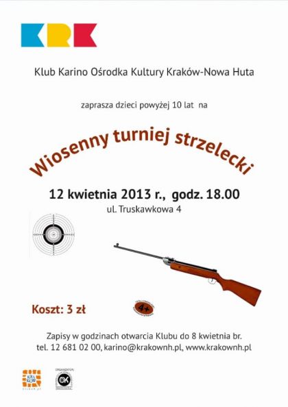 Serdecznie zapraszamy dzieci powyej 10 roku ycia na turniej strzelecki organizowany przez Klub Karino Orodka Kultury Krakw-Nowa Huta (ul. Truskawkowa 4).