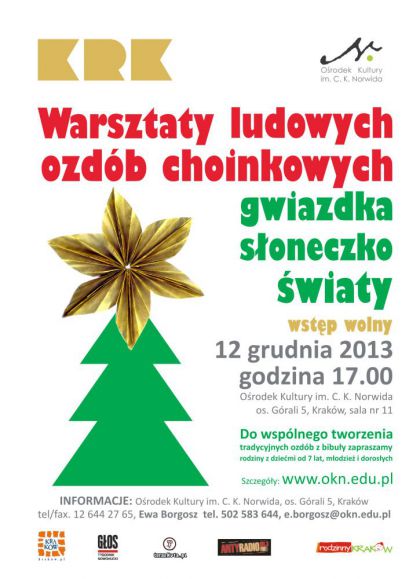 | Zapraszamy mionikw tradycji do wsplnego tworzenia dawnych ozdb choinkowych. Jest wiele moliwoci ubrania choinki zupenie inaczej ni co roku. W tym roku zapraszamy do nauki wykonania ozdb z bibuy. Gwiazda, zgodnie z tradycj, obowizkowo znajdowaa swoje miejsce na szczycie drzewka, bo to ona prowadzia mdrcw (zwanych pniej Trzema Krlami) do Betlejem. Wspczenie gwiazd czsto zastpuje szpic, ale jeli wolimy ozdobi nasze wit(...) ... więcej » |