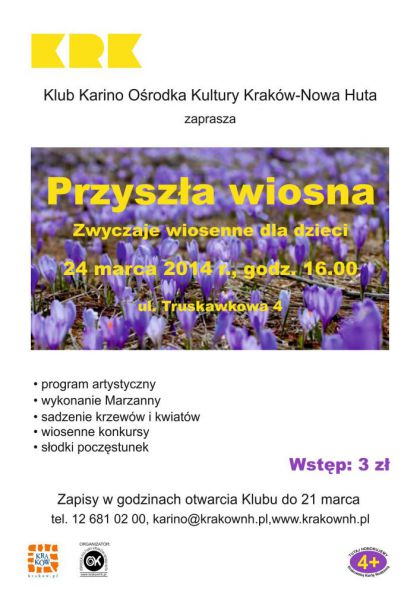 Jakie s zwyczaje zwizane z nadejciem wiosny? Dowiedz si tego dzieci w trakcie spotkania w Klubie Karino Orodka Kultury Krakw-Nowa Huta (ul. Truskawkowa 4) powiconego wiosennym obrzdom. Zajcia odbd si 24 marca o godz. 16.00.