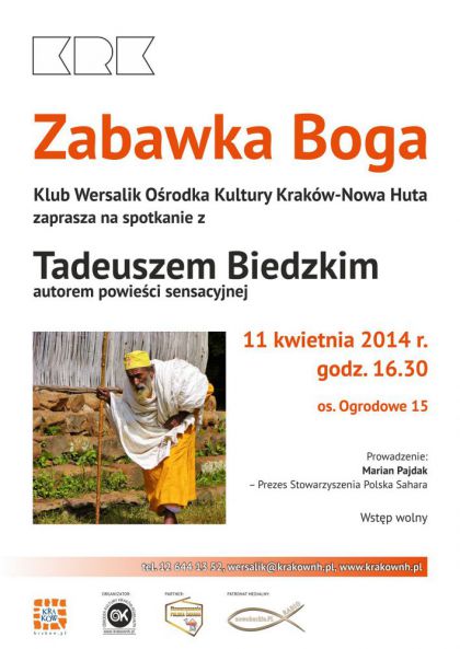 | Klub Wersalik Orodka Kultury Krakw-Nowa Huta (os. Ogrodowe 15) zaprasza 11 kwietnia o godz. 16.30 na spotkanie z Tadeuszem Biedzkim, autorem sensacyjnej powieci Zabawka Boga, ktrej akcja toczy si w Afryce. Wydarzenie poprowadzi Marian Pajdak prezes Stowarzyszenia Polska Sahara. Tadeusz Biedzki od dwudziestu lat podruje z on po wiecie, zagldajc tam, gdzie nie dociera wikszo turystw. Niezwyke i niebezpieczne przygody opisuje w ks(...) ... więcej » |