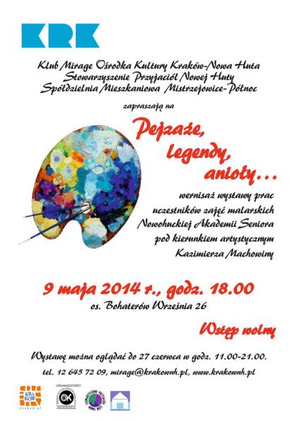 Wernisa wystawy malarstwa grupy rysunku z Nowohuckiej Akademii Seniora prowadzonej przez artyst malarza Kazimierza Machowin. Na prezentowanych obrazach zobaczy bdzie mona oprcz rnorakich pejzay rwnie anioy oraz bohaterw i historie pdzlem pisane w legendach.