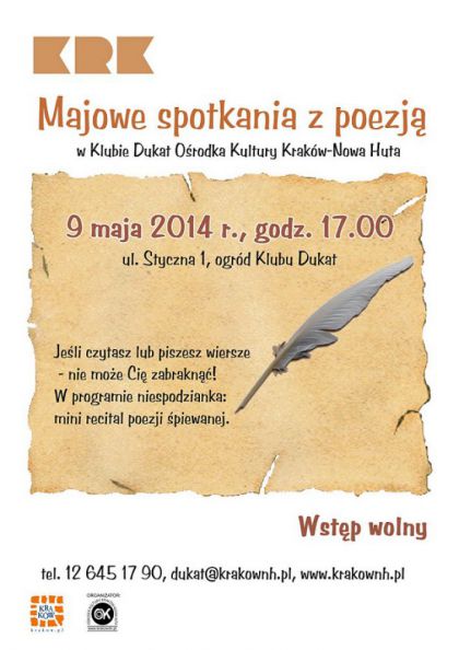 Spotkanie mionikw poezji w ogrodzie Klubu Dukat Orodka Kultury Krakw-Nowa Huta zarwno dla dorosych jak i modych ludzi wszystkich tych, ktrzy pisz, czytaj lub recytuj wiersze. Kady z goci bdzie mg zaprezentowa swoje ulubione utwory poetyckie lub wasne wiersze. W trakcie wydarzenia planowany jest mini recital modych wykonawcw poezji piewanej.