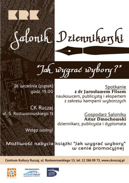 Na najbliszym spotkaniu, o tym jak wygra wybory, opowie dr Jarosaw Flis, wybitny ekspert w dziedzinie prowadzenia kampanii wyborczych, publicysta Tygodnika Powszechnego i Gazety Wyborczej.