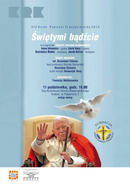 W sobot, 11 padziernika, w Dworku Biaoprdnickim obchodzi bdziemy XIV Dzie Papieski. Na t okazj zosta przygotowany specjalny koncert Szukaem Was Bracia, ktry wzbogacony zostanie o recytacje wierszy. Gomi specjalnymi wydarzenia bd inf. Bronisaw Fidelus oraz Stanisaw Dziedzic.