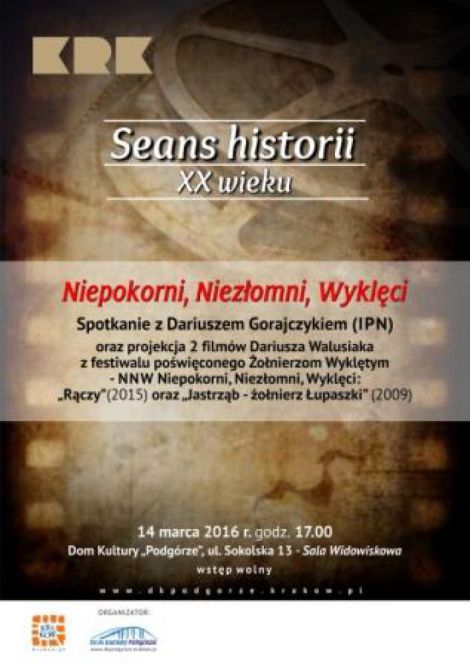 Seans historii XX wieku - Niepokorni, Niezomni, Wyklci - spotkanie z Dariuszem Gorajczykiem (IPN) oraz projekcja 2 filmw Dariusza Walusiaka z festiwalu powiconego onierzom Wykltym - NNW Niepokorni, Niezomni, Wyklci : "Rczy(2015) oraz "Jastrzb - onierz upaszki" (2009)