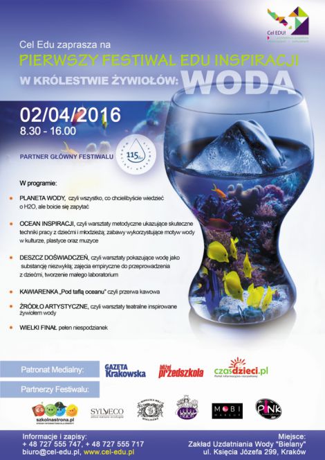 Serdecznie zapraszamy na pierwsz edycj Festiwalu Edu Inspiracji " W krlestwie ywiow: WODA", ktry odbdzie si 2 kwietnia 2016 roku w Zakadzie Uzdatniania Wody "Bielany" w Krakowie.