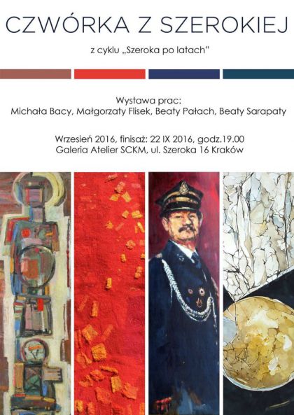 | We wrzeniu zapraszamy do Galerii Atelier SCKM przy ul. Szerokiej 16 w Krakowie na wystaw prac Magorzaty Flisek, Beaty Paach, Beaty Sarapaty i Michaa Bacy. Jest to wydarzenie wpisujce si w Jubilieusz 50-lecia Staromiejskiego Centrum Kultury Modziey. Finisa wystawy 22 wrzenia 2016 o godz. 19.00.(...) ... więcej » |