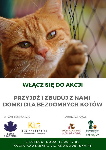5 godzin dobrej zabawy, 6 kocich pomocnikw i budowa 20 domkw to wszystko czeka Krakowian w dniu 2 lutego. W Kociej Kawiarni, przy ul. Krowoderskiej 48 odbdzie si akcja budowania domkw dla wolnoyjcych krakowskich kotw. Ocieplone i wyposaone w miseczk z karm schronienia pozwol im przetrwa zim. Szykuje si wyjtkowy dzie.