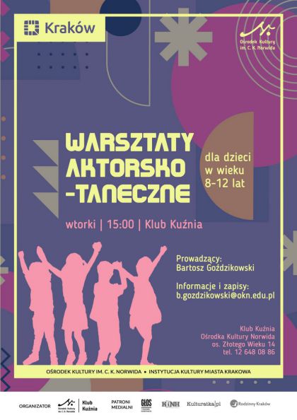 Warsztaty aktorsko-taneczne to zajcia skierowane do dzieci w wieku 8-12 lat. Prowadzcy: Bartosz Godzikowski aktor, tancerz, instruktor. Podczas zaj uczestnicy bd poznawa podstawy gry aktorskiej, taca klasycznego, wspczesnego, jazz i modern.