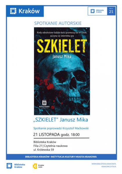 „Szkielet” to trzeci kryminał Janusza Miki, którego bohaterem jest dziennikarz śledczy Kornel Rączy. Akcja rozgrywa się na krakowskiej Krowodrzy. Książka posiada dwie narracje: współczesną i retrospektywną z okresu II wojny światowej. Łączą się one w nieoczekiwany sposób w finale powieści. Prowadzenie: Krzysztof Maćkowski.(...)  ... więcej »