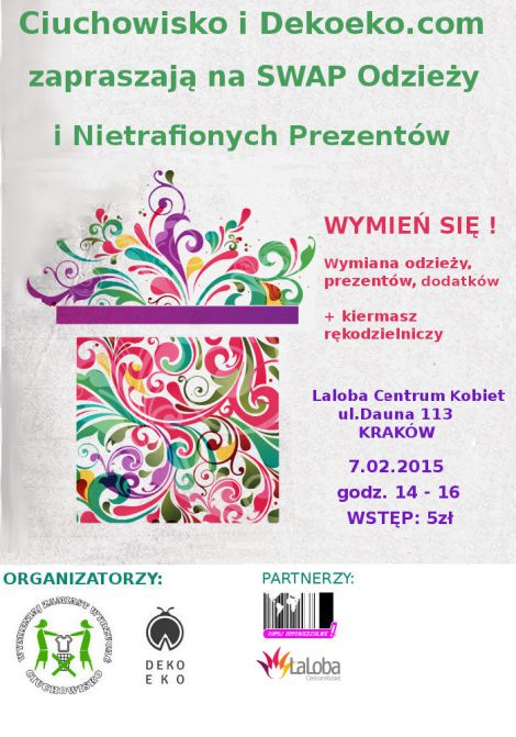Tym razem Ciuchowisko bdzi wsporganizowane z Dekoeko.com. Tak wic bdzie to 9 edycja Krakowskiego SWAP-u poczona z wymian nietrafionych prezentw w ramach projektu WIETA W ROWNOWADZE:)