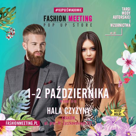 Za oknami już jesienna pogoda, a to idealna okazja, aby odświeżyć swoją szafę i zaopatrzyć się w najmodniejsze trendy tego sezonu! Potrzebujesz cieplejszej kurtki, kolorowego sweterka? A może szukasz czegoś dla dzieci, czy partnera? Koniecznie przyjdź na targi mody autorskiej i wzornictwa Fashion Meeting, które odbędą się w Krakowie w dniach 1 i 2 października w Hali Czyżyny przy ul. prof. M. Życzkowskiego 227. Jesienne kolekcje polskich marek czekają na Ciebie! Targi będą częścią wielkiego festiwalu #KupujŚwiadomie (www.kupujswiadomie.pl), który przypomina na czym polegają świadome zakupy!